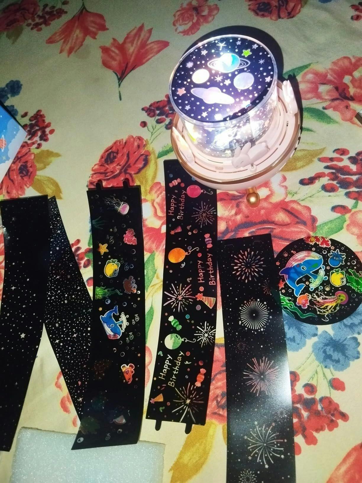 Comes with 6 stunning interchangeable films – stars ⭐, galaxies 🌌, bunnies 🐰, and more! Creates a peaceful, dreamy atmosphere for kids.